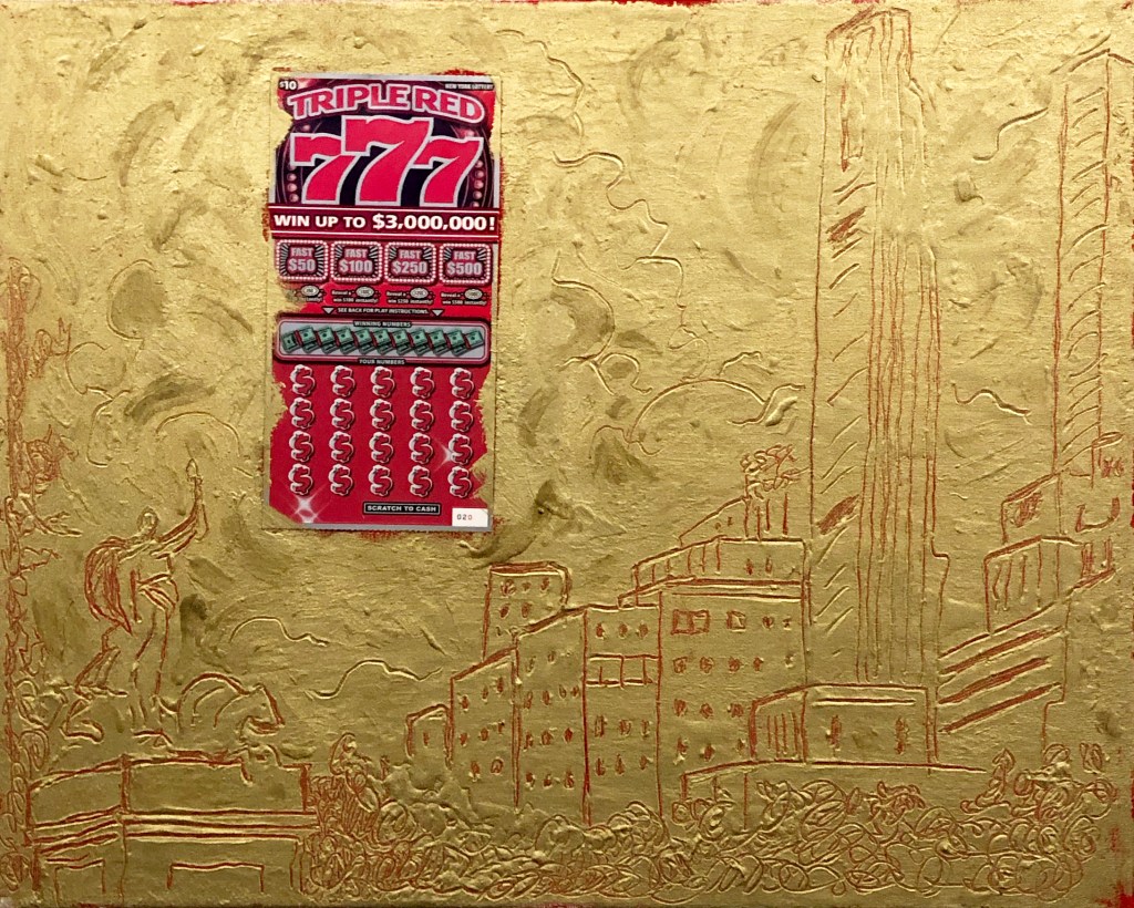 Mixed Media with unscratched New York Lottery Tickets.